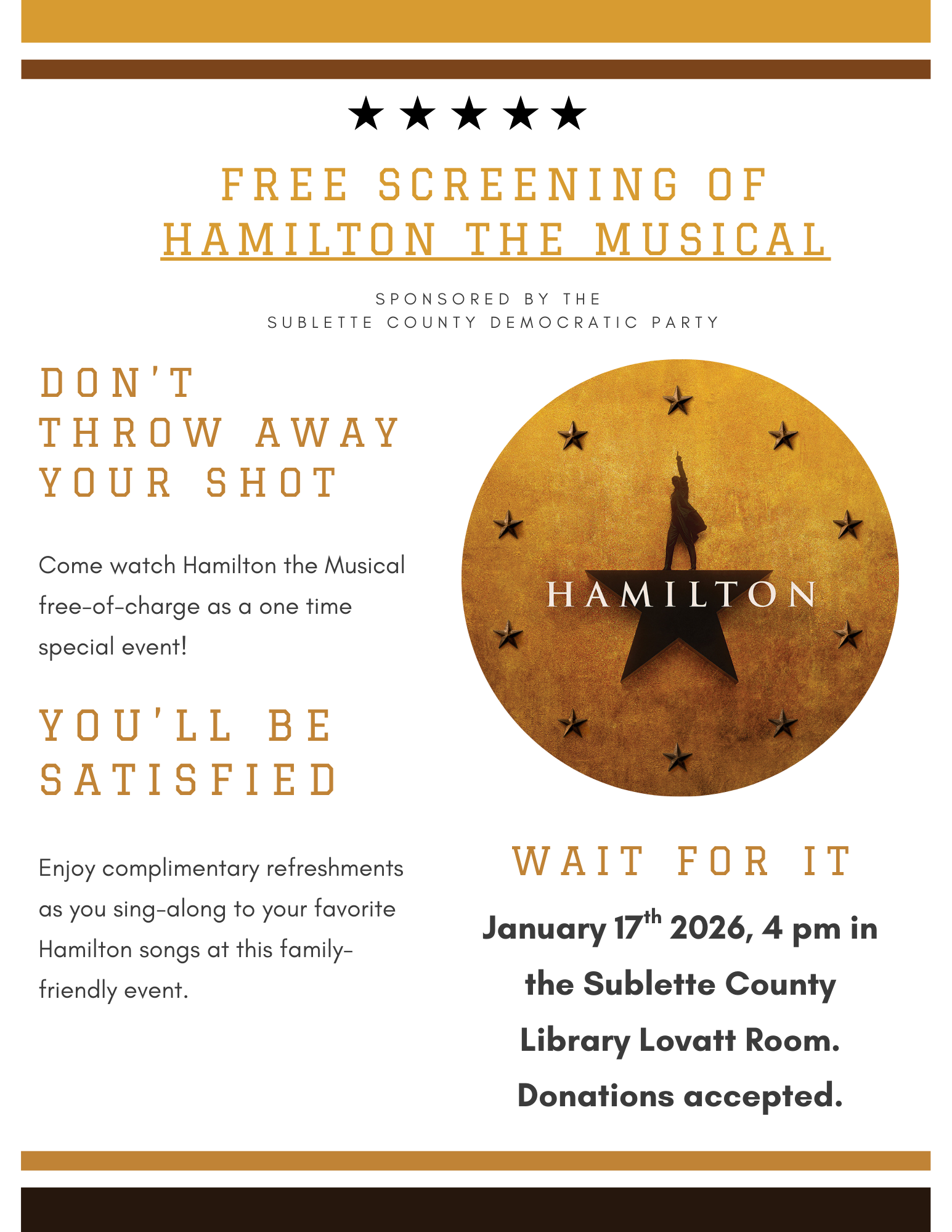 Join us on Saturday, January 17th, at 4 pm in the Sublette County Library Lovatt Room for a free screening of Hamilton the Musical! Complimentary refreshments will be provided and singing-along is encouraged. During these lonely winter months, it’s important we come together as a community and remember the ideas, beliefs, and core values of our founding fathers to which our nation was built.